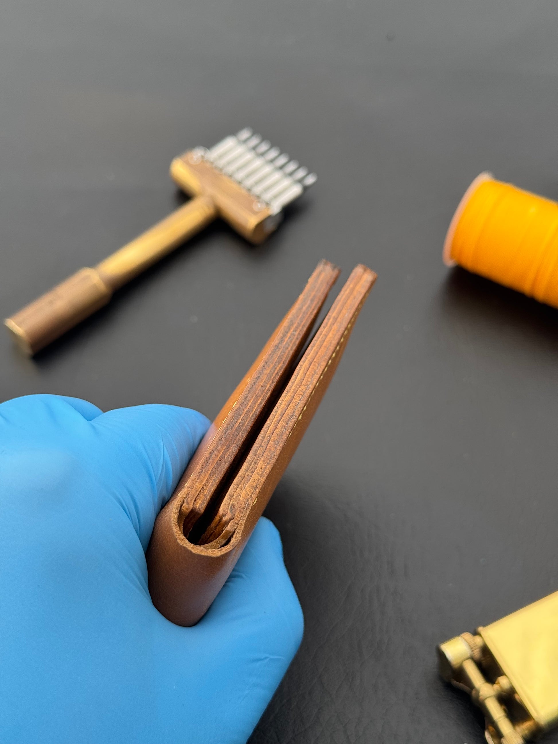 Before machines existed, leather goods were stitched completely by hand. We still use that same traditional“Saddle Stitch”a method known for lasting far longer than machine seams. Every stitch is done by a craftsman using two needles, creating a stronger, more reliable bond that won’t unravel.